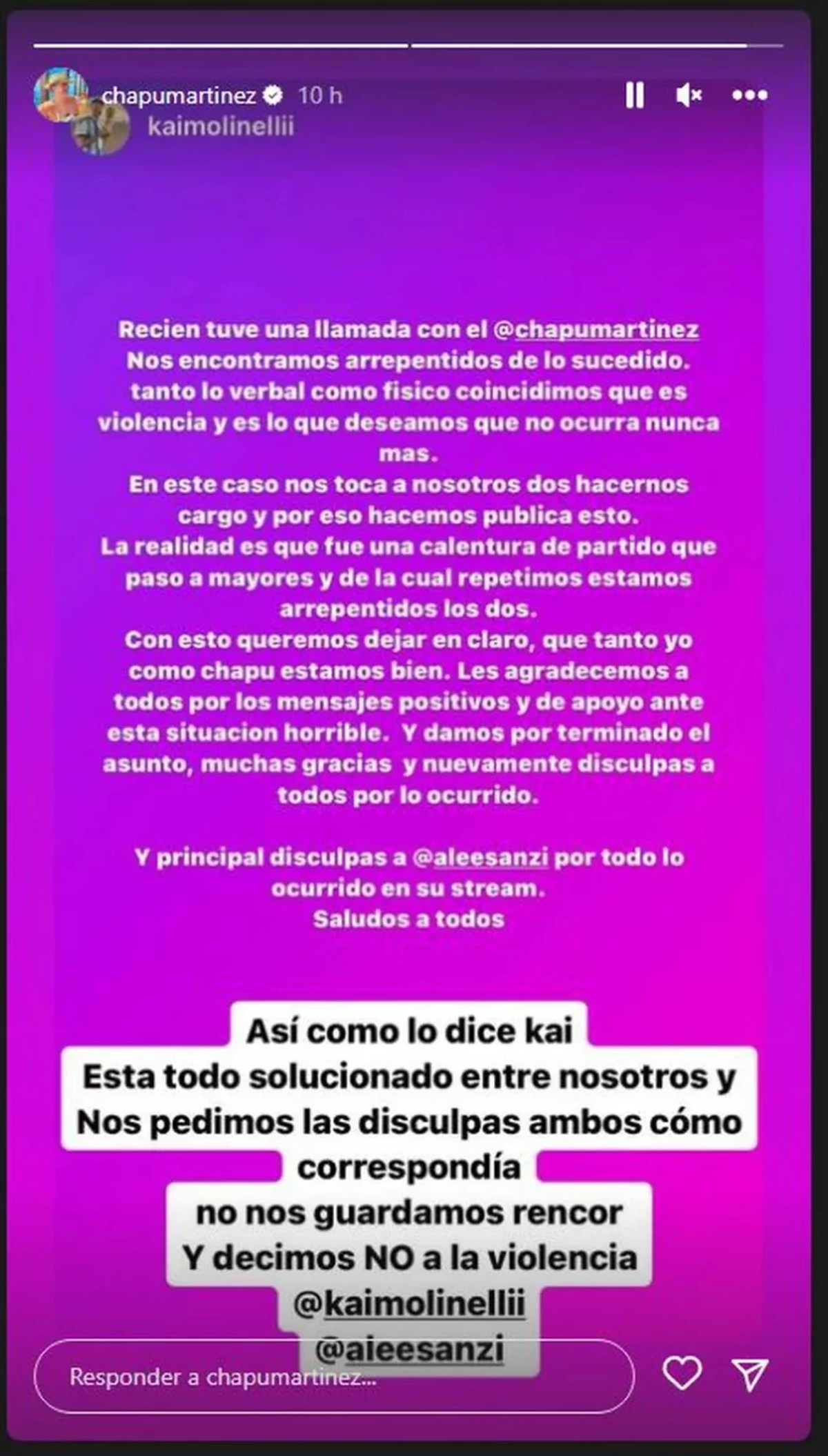 Esta gresca terminó con Kai Molinelli pidiéndole disculpas públicas al Chapu por la situación. "Recién tuve una llamada con el @chapumartinez. Nos encontramos arrepentidos de lo sucedido. Tanto lo verbal como físico, coincidimos que es violencia y es lo que deseamos que no ocurra nunca más. En este caso nos toca a nosotros dos hacernos cargo y por eso hacemos público esto. La realidad es que fue una calentura de partido que paóo a mayores y de la cual, repetimos, estamos arrepentidos los dos. Con esto queremos dejar en claro, que tanto yo como chapu estamos bien. Les agradecemos a todos por los mensajes positivos y de apoyo ante esta situación horrible".