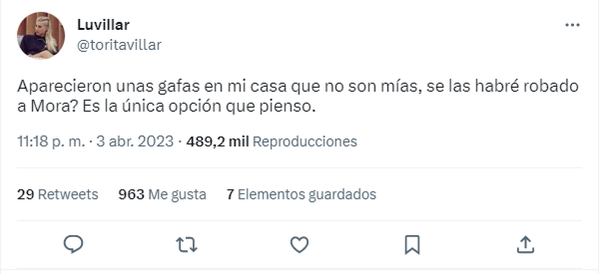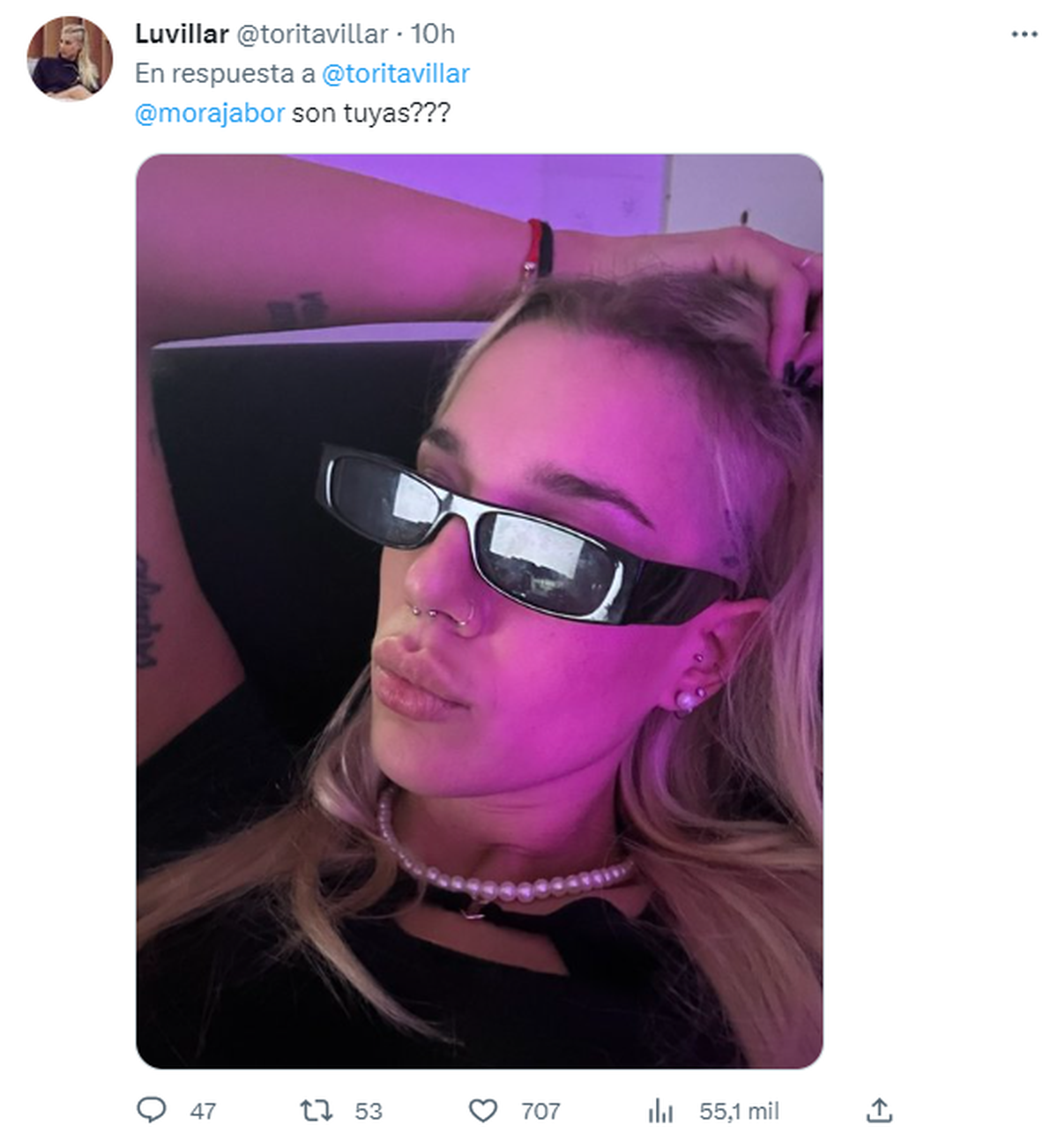 “Aparecieron unas gafas en mi casa que no son mías, ¿se las habré robado a Mora? Es la única opción que pienso”, tuiteó en primer lugar Tora Villar en su cuenta de Twitter. Lo que parecía un simple tuit terminó desatando una pelea, pero para sorpresa de todos sus seguidores.