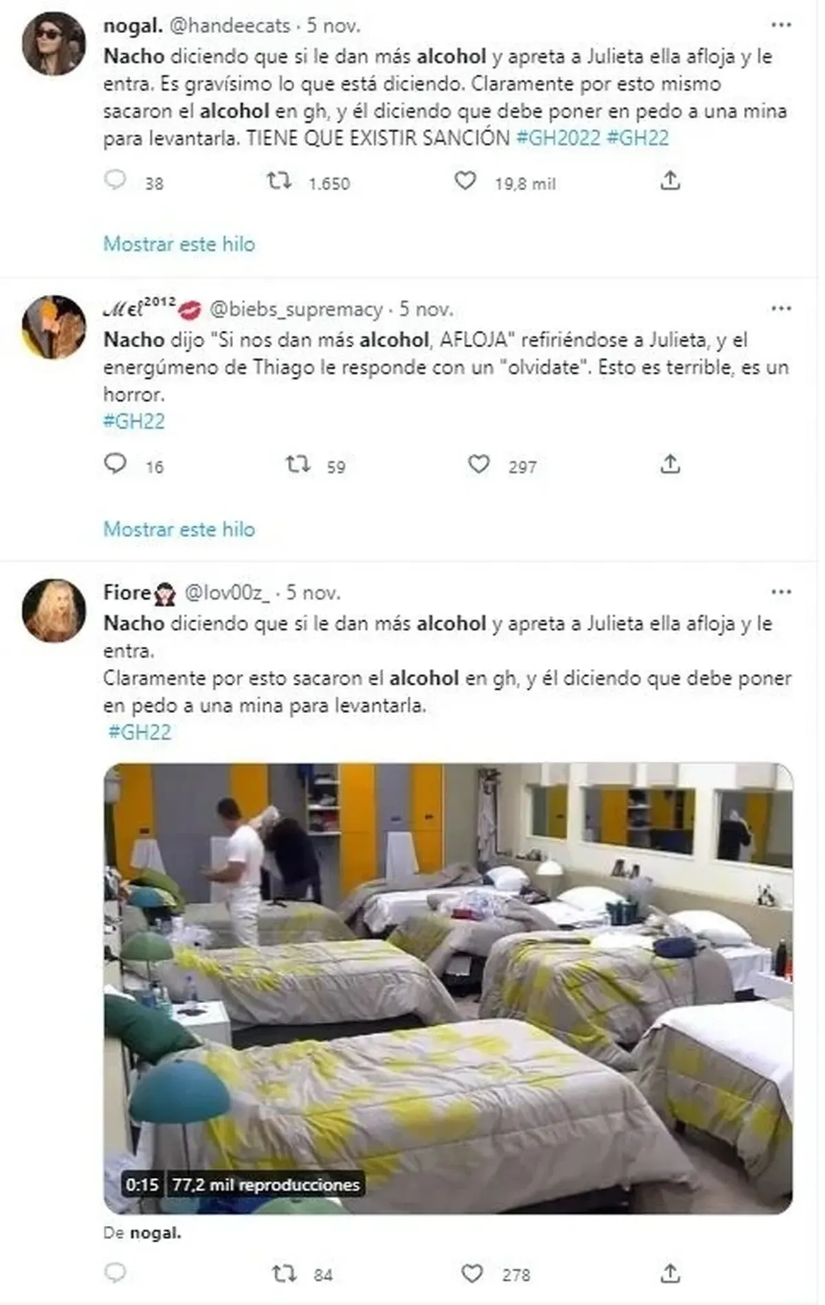 “Nacho diciendo que si le dan más alcohol y aprieta a Julieta, ella afloja y le entra. Es gravísimo lo que está diciendo. Claramente por esto mismo sacaron el alcohol en GH, y él diciendo que debe poner en pedo a una mina para levantarla. Tiene que existir sanción”, no dudó en remarcar una de tantas usuarias de Twitter ante la gravedad del comentario teniendo en cuenta el antecedente del caso de la participante española abusada.