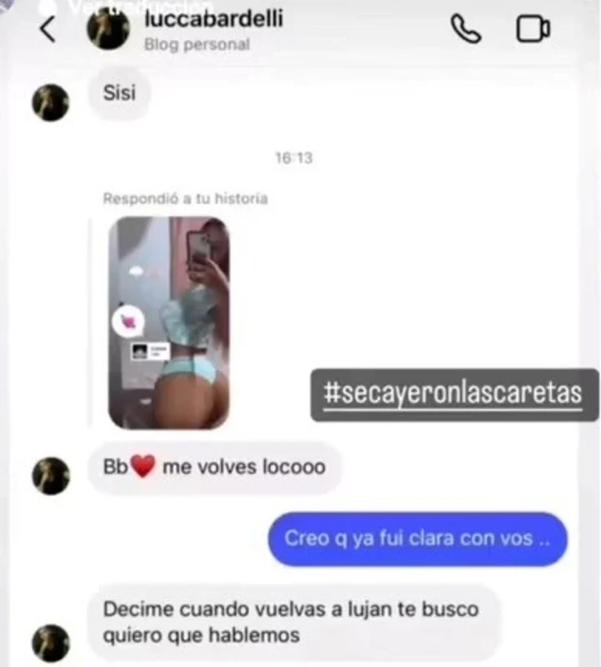 Hace unos días salieron a la luz unos chats que serían de Bardelli con otra mujer. Se trata de Rocío Galera, una joven influencer que tiene casi 100 mil seguidores en sus redes. Y fue ella quien publicó una conversación que aparentemente habría tenido con Lucca a través de Instagram.