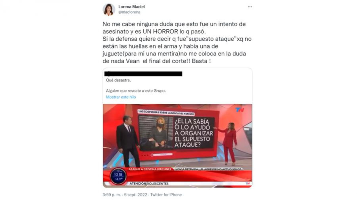 "Que hay cosas que no están coincidiendo y que no coinciden desde el inicio", siguió el periodista. "Igual,la causa por la magnitud de lo que pasó es homicidio en grado de tentativa, habrá que ver a la luz de todas la pruebas si esto también pudo haber sido armado y nadie la quiso matar. La Justicia investiga que quisieron matar a la vicepresidenta, hay que ver si esto se prueba o no", explicó Maciel, quien minutos más tarde también expresó su postura en Twitter, dejando en claro que ella no dudaba de lo ocurrido.