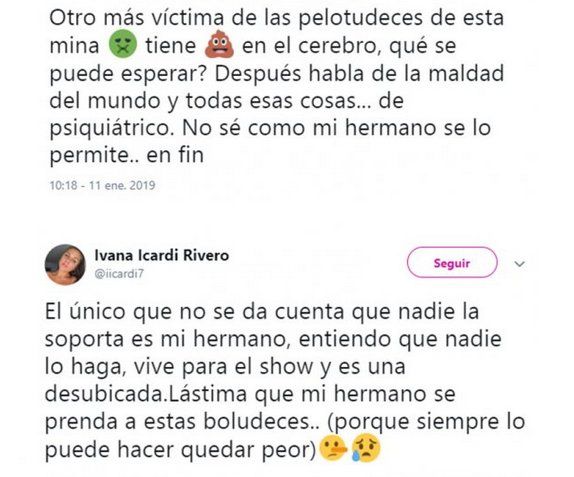 Al ver esto, Ivana lo apoyó. “Otro más víctima de las pelotudeces de esta mina. Tiene… en el cerebro. ¿Qué se puede esperar? Después habla de la maldad del mundo y todas esas cosas… Es de psiquiátrico. No sé como mi hermano se lo permite… en fin”, lanzó en Twitter.