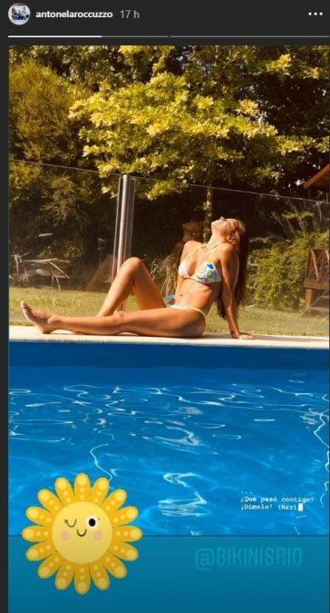 Además de la vida social junto al crack del fútbol, y de pasar tiempo junto a sus familiares, Anto Roccuzzo, también aprovecha para disfrutar del sol y el agua. En una de sus últimas publicaciones en su cuenta de Instagram, la esposa del seis veces ganador, se mostró super sexy al costado de una pileta y casi que posó como una modelo con su bikini multicolor. A su vez, añadió un fragmento de la canción Tusa, interpretada por Karol G y Nicki Minaj.