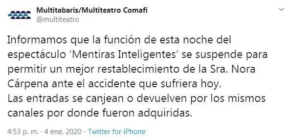 Poco tiempo después, la cuenta oficial del teatro donde protagoniza "Mentiras inteligentes" junto a Fede Bal, Mica Vázquez y Arnaldo André informaron que la función queda suspendida: "Confirmamos que ante el accidente sufrido por la Sra. Nora Cárpena en Mar del Plata, la función de esta noche del espectáculo ‘Mentiras Inteligentes’ se encuentra supeditada a su estado clínico”.