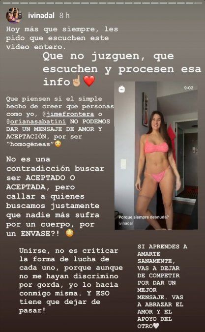 “Hoy más que siempre, les pido que escuchen este video entero. Que no juzguen, que escuchen y procesen esa info. Que piensen si el simple hecho de creer que personas como yo, @jimefrontera o @orianasabatini no podemos dar un mensaje de amor y aceptación, por ser ‘homogéneas’”, comenzó su mensaje.
