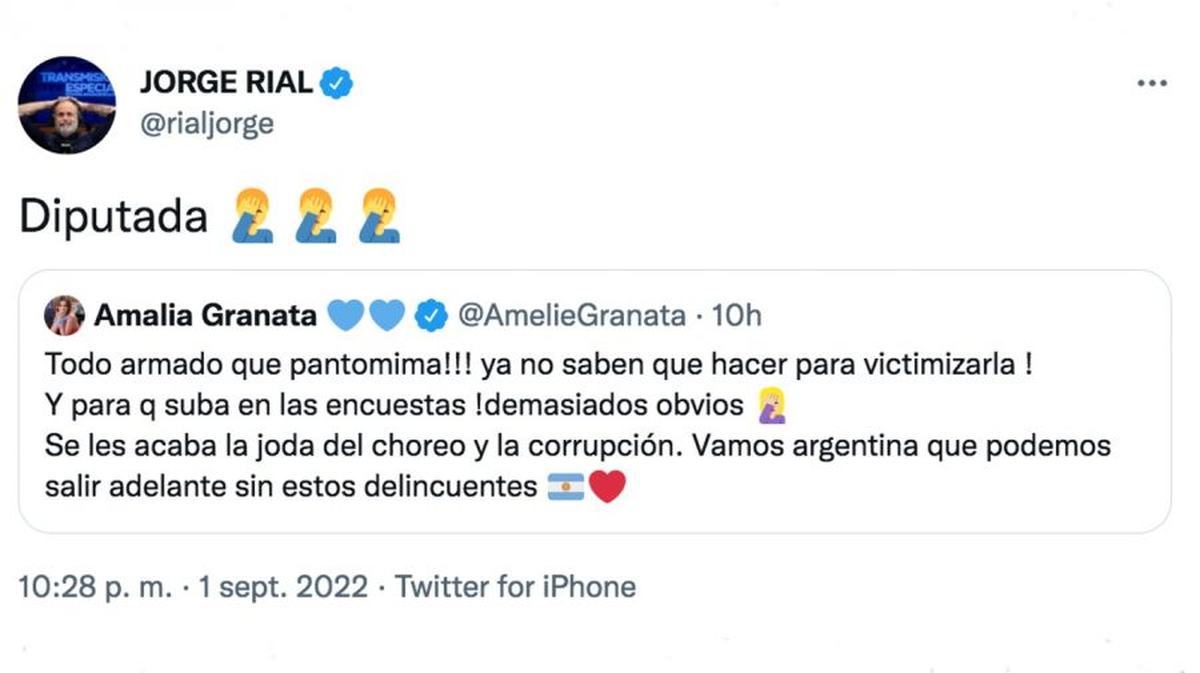 El periodista respondió a los dichos de la diputada de la Provincia de Santa Fe, en los que pone en duda el atentado que sufrió la vicepresidenta. Rial escribió "diputada" junto a tres emojis de un hombre con una mano en el rostro, en señal desapruebo a lo expresado por Granata.