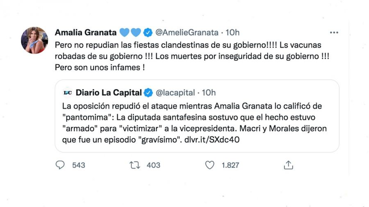 Luego, la diputada y panelista de "Polino Auténtico" (Radio Mitre) criticó las reacciones de los dirigentes de los partidos contrarios al Kirchnerismo: "¡Qué tibia la oposición con esta casta no salimos más!". Sin embargo, minutos más tarde, el periodista Martín Sperati contó en su cuenta de Twitter que Amalia podría ser desplazada de su cargo político por sus dichos: "Me dicen que van a pedir remover de la Cámara de Diputados y diputadas a Amalia Granata por sus dichos sobre el intento de asesinato a CFK".