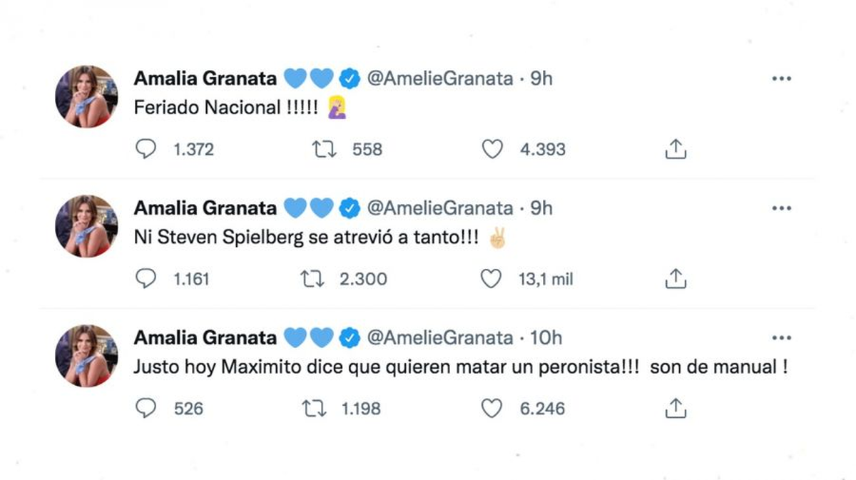 Sin ánimos de silenciarse ante lo ocurrido, Amalia continuó con sus dichos aún ya adentrada la madrugada: "¡Ni Steven Spielberg se atrevió a tanto!"; "¡Justo hoy Maximito dice que quieren matar un peronista! ¡Son de manual!"; "Las pruebas del fiscal son tan contundentes que la desesperación es evidente"; "¡Ella es brillante! Logró quedar como mártir y que la oposición le rinda homenaje y le regale la reelección y los fueros! ¡La aplaudo de pie, se los fuma bajo el agua a TODES!".