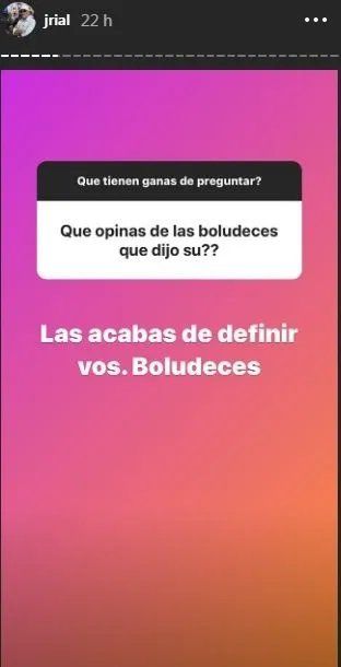 Una de ellas fue Jorge Rial. Al escuchar los dichos de la diva, el conductor de "Intrusos" utilizó sus redes sociales para hacer referencia la tema y, a través de su cuenta de Instagram, un usuario le preguntó qué opina de las "bolude..." que dijo Giménez.