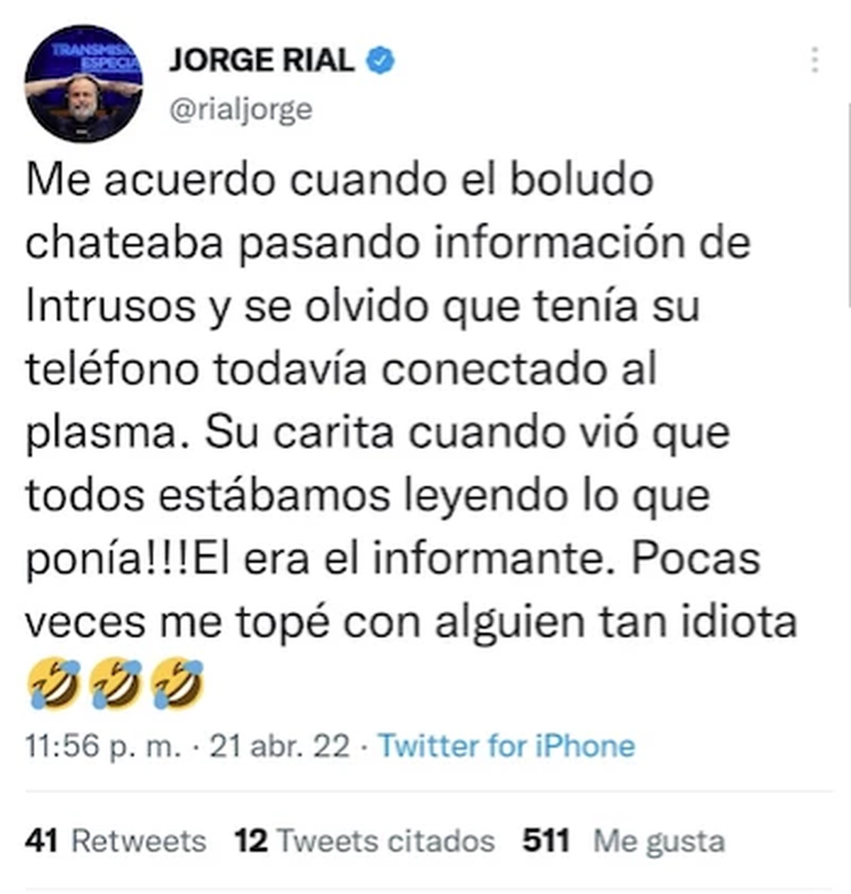 Después, en Twitter, siguió tirando data inflamable. "Me acuerdo cuando el boludo chateaba pasando información de Intrusos y se olvidó que tenía su teléfono todavía conectado al pasma. Su carita cuando vio que todos estábamos leyendo lo que ponía!!! El era el informante. Pocas veces me topé con alguien tan idiota" cerró Rial junto a tres o cuatro caras sonrientes. En el chat paralelo de Intrusos había 4 caballeros: Adrián Pallares, el que lo creó, Damián Rojo, Dani Ambrosino y Guido Záffora.