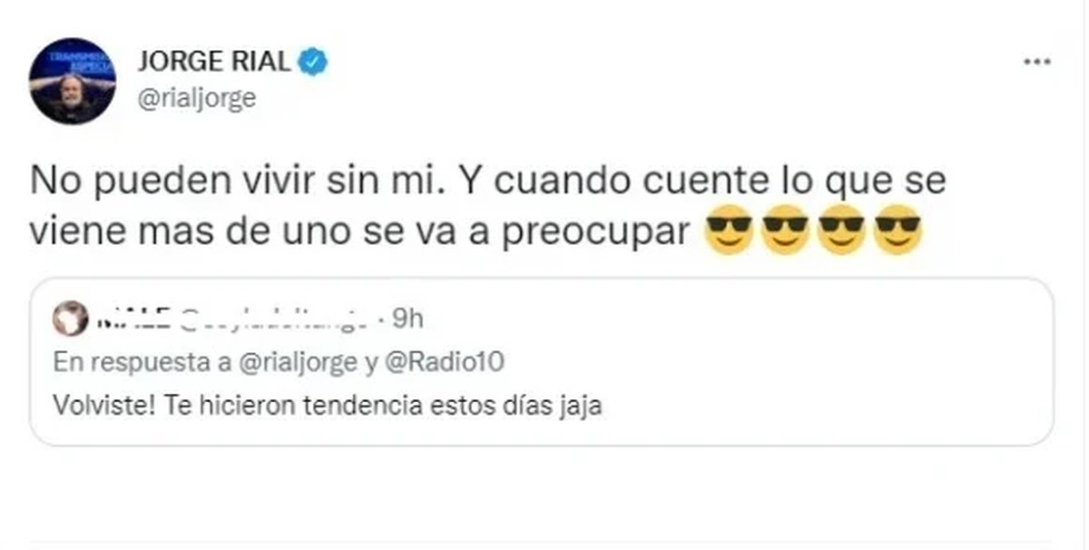 Sin embargo, Jorge Rial lanzó una frase y una llamativa advertencia. “No pueden vivir sin mí. Y cuando cuente lo que se viene más de uno se va a preocupar”, comentó el periodista jugando al misterio.