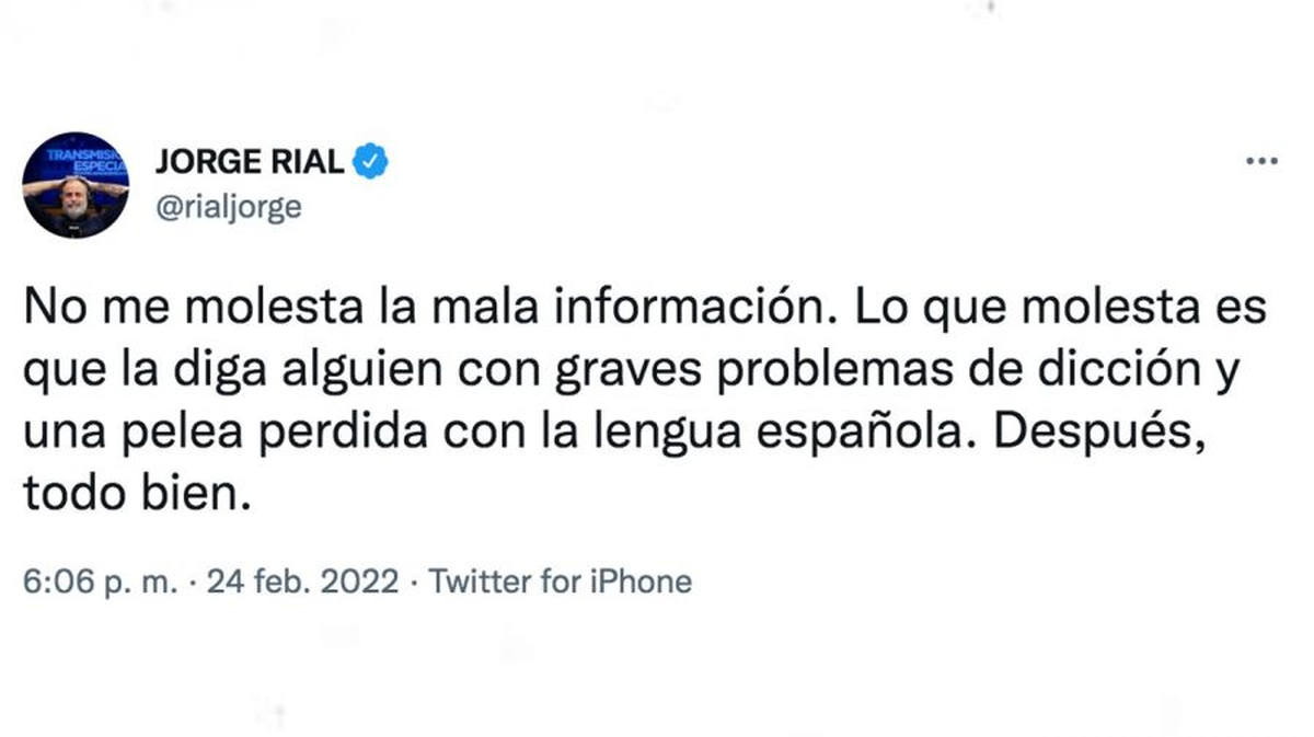 Rial acudió a Twitter y afiló sus palabras para nuevamente criticar a Marcela Tauro: "No me molesta la mala información. Lo que molesta es que la diga alguien con graves problemas de dicción y una pelea perdida con la lengua española. Después, todo bien".