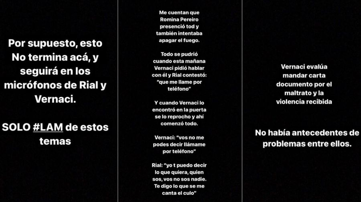 La Negra Vernaci se habría ido enojada y despotricando del encuentro: "¡Forro, pelotudo, fracasado!", mientras que Jorge Rial explicó la razón por la que nunca habló con ellos sobre la nueva conducción: "Yo a vos no te conozco, no soy tu amigo. No tengo que avisarte que voy a hacer el programa". De Brito afirmó que en la discusión se encontraba presente Romina Pereiro, quien intentó calmar las tensiones sin éxito; por otro lado, el periodista confesó que Vernaci pensará si iniciar acciones legales contra Jorge por "por maltrato y la violencia recibida".