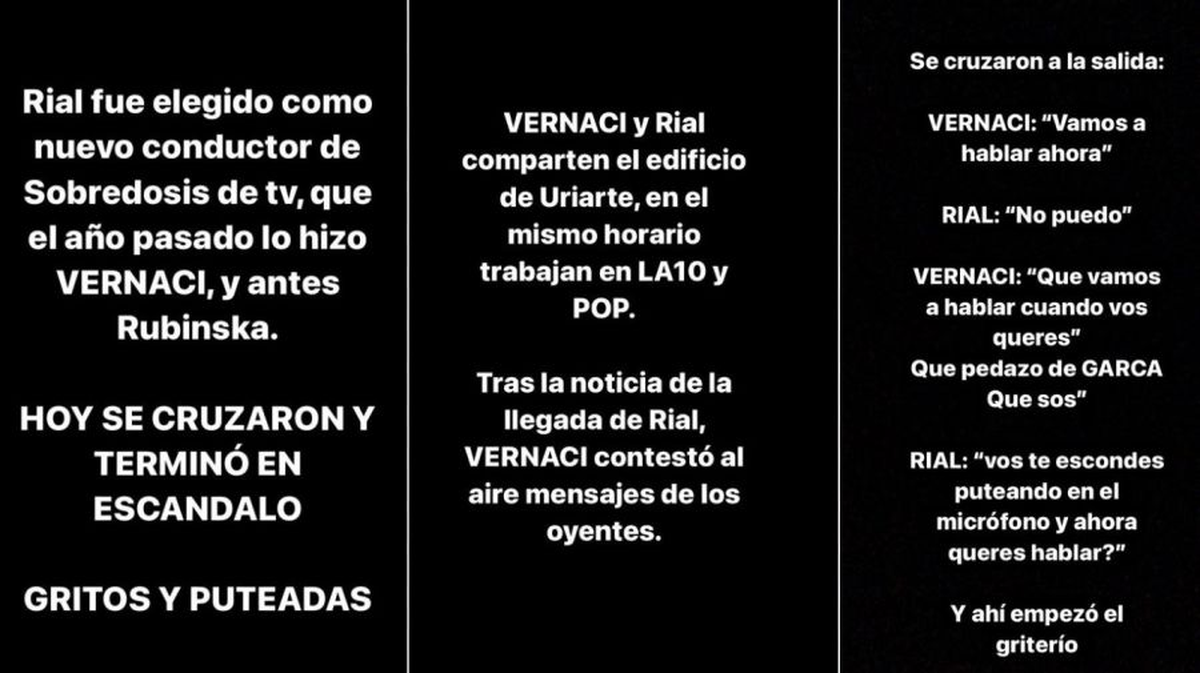 Sin embargo, según la información compartida por Ángel de Brito, al cruzarse en la salida del grupo radial, Vernaci le pidió a Rial hablar y este se negó con estas palabras: "No puedo", cosa que le desagradó por completo a Elizabeth y la hizo refutar: "¿Qué?, ¿vamos a hablar cuando vos querés? ¡Que pedazo de garca que sos!", a lo que el exconductor de "TV Nostra" respondió: "¿Vos te escondes puteando en el micrófono y ahora querés hablar?".