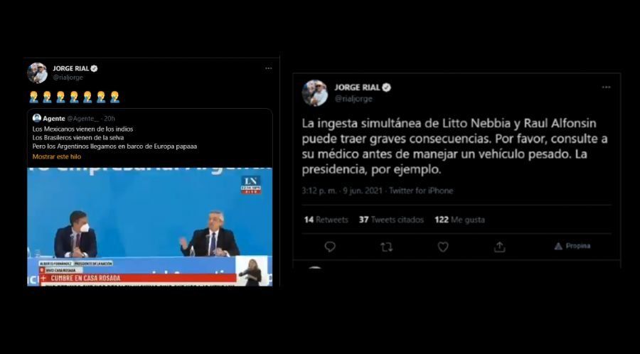 Alejado de la televisión tras su renuncia en América y el final de TV Nostra, Rial utiliza Twitter para otorgar sus opiniones, y le dedicó una seguidilla de comentarios al jefe de Estado luego de la conferencia de prensa que este dio el miércoles junto con el presidente de España, Pedro Sánchez.