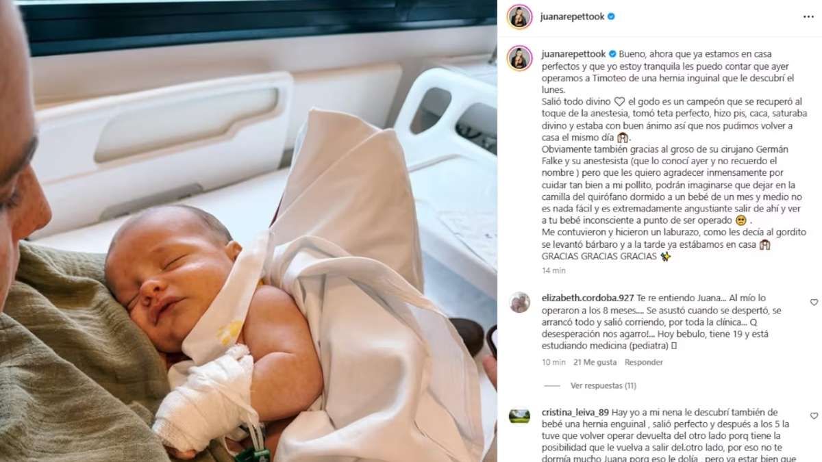 Lo que comenzó como una semana normal se transformó en una preocupación inmediata para Juana Repetto. Según relató la hija de Reina Reech en sus redes sociales, el pasado lunes detectó una anomalía en su bebé de un mes y medio que derivó en un diagnóstico de hernia inguinal.