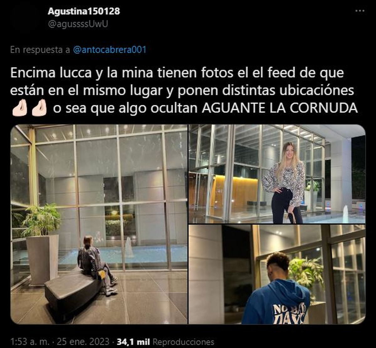 "Luca y la mina tienen fotos del feed de que están en el mismo lugar y ponen distintas ubicaciones", escribió una usuaria de la red social, mostrando las dos fotos. Allí se puede ver cómo ambos jóvenes están en un lugar que parece ser el mismo, aunque den información diferente.