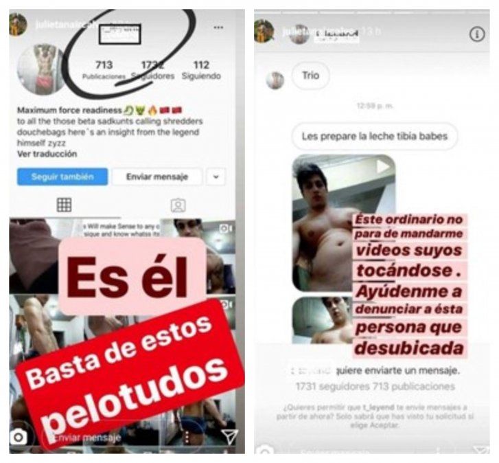 En los últimos días, Julieta fue noticia por escrachar a un hombre que le enviaba mensajes privados con videos donde se masturbaba. Lo denunció ante Instagram y puso una captura para que todos vean el contenido perverso.