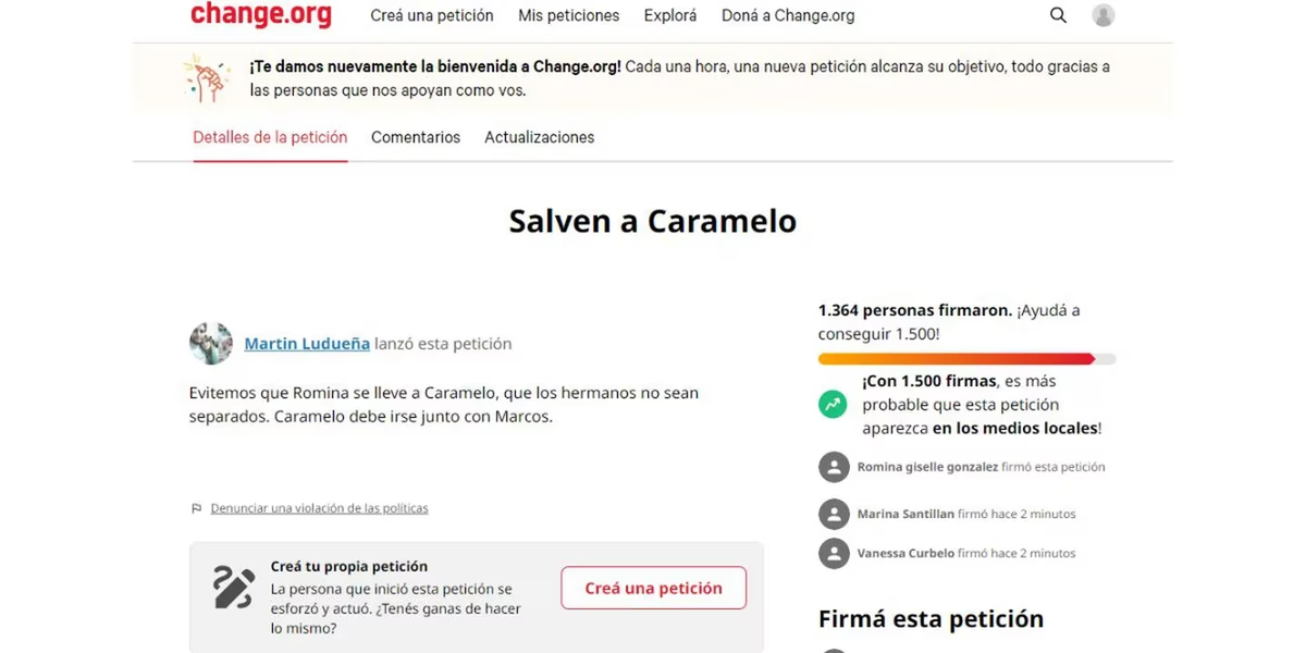 “Evitemos que Romina se lleve a Caramelo, que los hermanos no sean separados. Caramelo debe irse junto con Marcos”, sostiene la propuesta lanzada a través de Change.org lanzado por Martín Ludueña. Hasta el momento la convocatoria juntó 1.364 firmas en tan solo pocas horas.