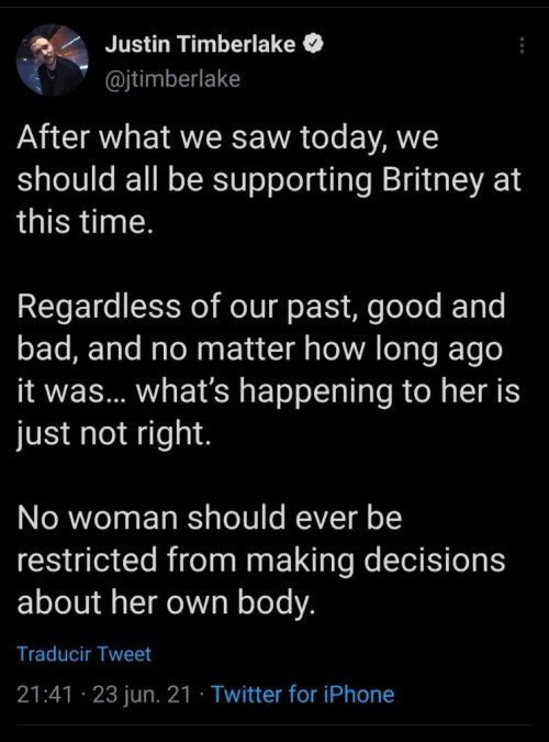 Tras sus reveladoras declaraciones, Justin Timberlake, su novio de la juventud que la acompañó en su momento de mayor fama entre 1999 y 2002, emitió un reflexivo mensaje en sus redes sociales en donde pidió apoyar a Britney en esta etapa de su vida: "Después de lo que vimos, debemos apoyar a Britney en este momento".