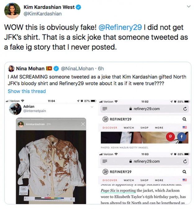 Es por ello que, Kim tomó Twitter para callar al sitio web por caer en la pesada burla de los usuarios, manifestando: “¡GUAU esto es obviamente falso! @ Refinery29 No obtuve la camisa de JFK. Esa es una broma enferma que alguien tuiteó como una historia falsa de ig que nunca publiqué”.