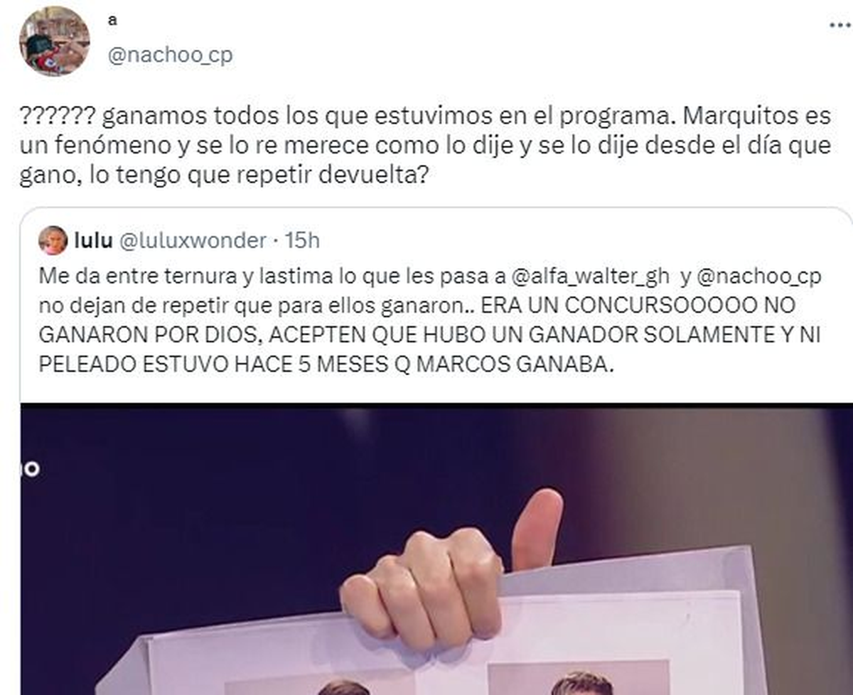 ‘’Dije que ‘ganamos’ todos los que estuvimos en el programa. Marquitos es un fenómeno y se lo re merece’’, aclaró el joven de 19 años y continuó muy enojado: ‘’Como lo dije y se lo dije desde el día que ganó, lo tengo que repetir devuelta???’’, escribió tajante Nacho.