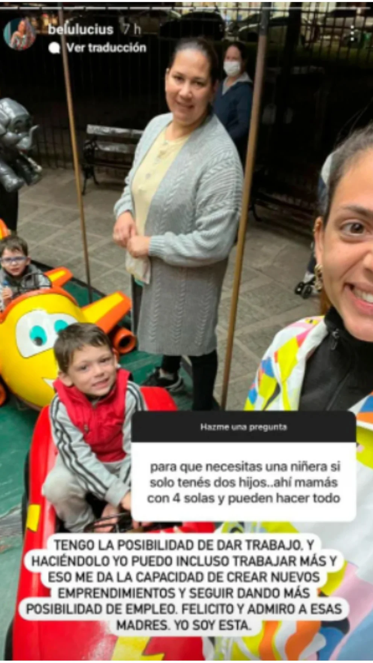 Pero el cruce más tenso llegó cuando otra seguidora le espetó: “¿Para qué necesitás una niñera si solo tenés dos hijos? Hay mamás con cuatro, solas, y pueden hacer todo”. Con educación, pero firmeza, la ex participante de Masterchef Celebrity le contestó: “Tengo la posibilidad de dar trabajo y haciéndolo, yo puedo incluso trabajar más y eso me da la capacidad de crear nuevos emprendimientos y seguir dando más posibilidad de empleo”. Y cerró, contundente, junto a una foto de la señora que la ayuda y su hijo: “Felicito y admiro a esas madres. Yo soy esta”.
