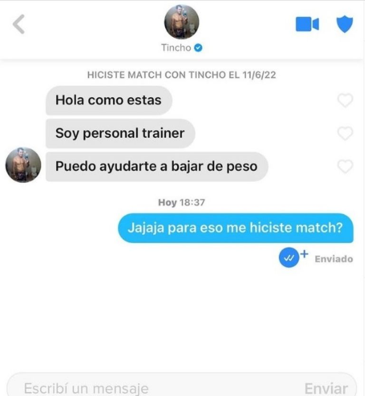 “Hola, ¿cómo estás? Soy personal trainer. Puedo ayudarte a bajar de peso”, le escribió el hombre en cuestión, cuyo perfil estaba verificado.