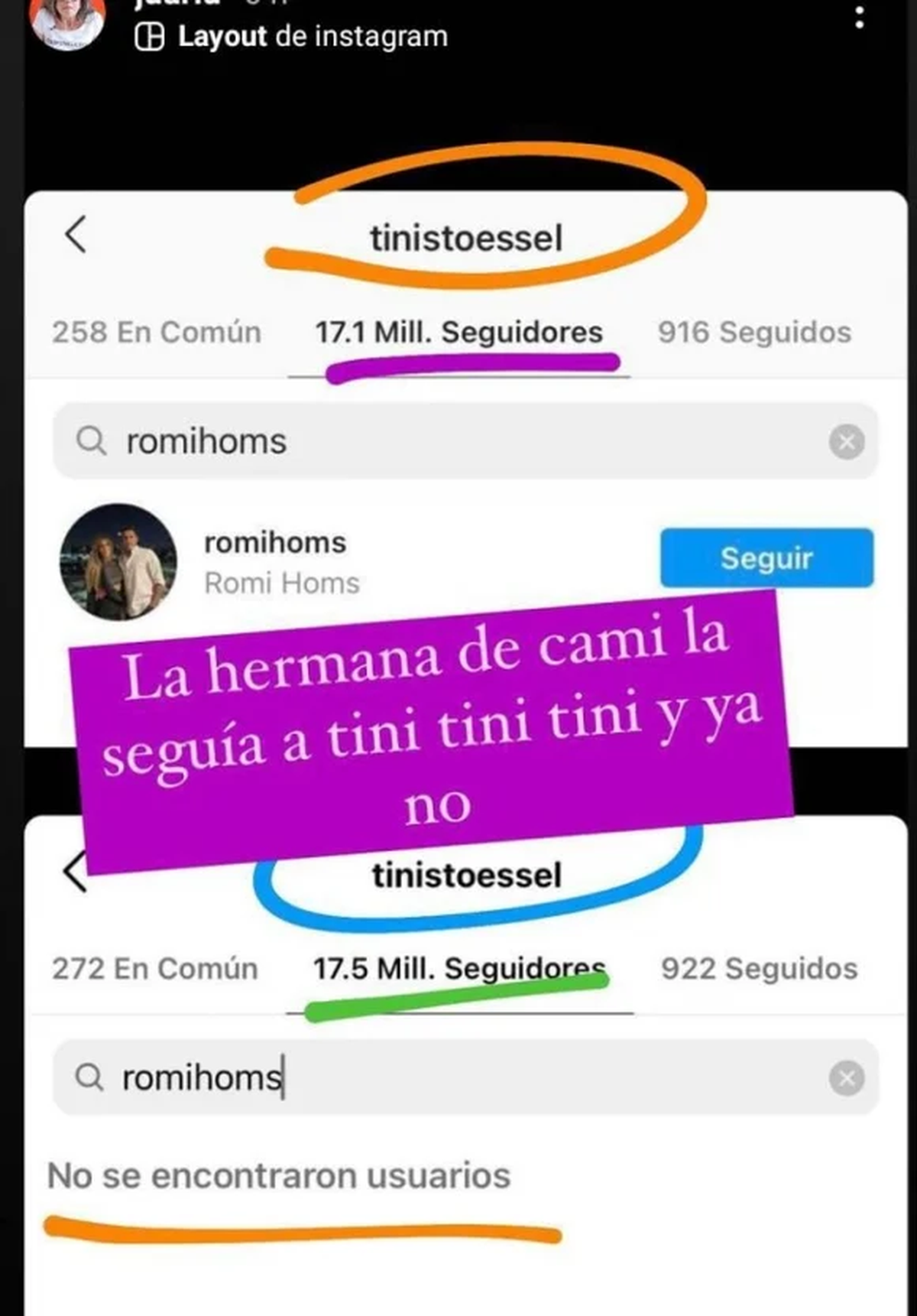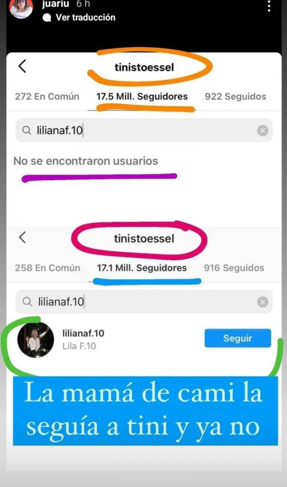 Atenta a lo que sucede en las redes sociales, Juariu compartió a través de sus stories de Instagram dos gestos 2.0 que la familia de Camila tuvo con Tiini ante los rumores de romance con Rodrigo. "La hermana de Camila la seguía a Tini, ya no. Y la mamá de Cami también la seguía, pero ya no", expresó Juariu junto a las capturas de pantalla que ilustran lo que afirma.