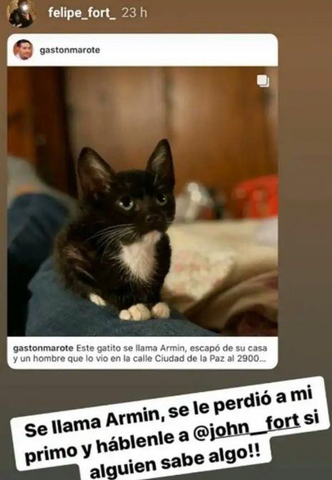 Felipe Fort, el hijo del recordado empresario Ricardo Fort, hizo un desesperado pedido a través de las redes sobre algo que tiene en vilo a toda la familia: la desaparición de un gatito, mascota de su primo.