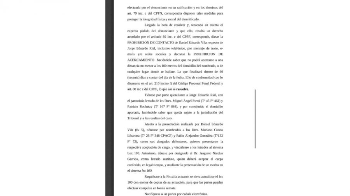 "Esto habla de la gravedad de lo que se está investigando", destacó Miguel Ángel Pierri, quien representa a Jorge, en diálogo con el portal BigBang. En concreto y, al menos por los próximos sesenta días, Vila deberá cumplir con dos restricciones: prohibición de contacto y también de acercamiento. "No podrá acercarse a una distancia no menor a los 100 metros del domicilio del nombrado (Rial) o de cualquier lugar donde se hallare", precisa el documento.