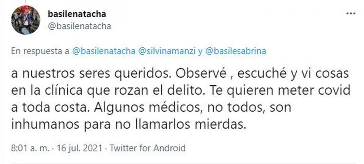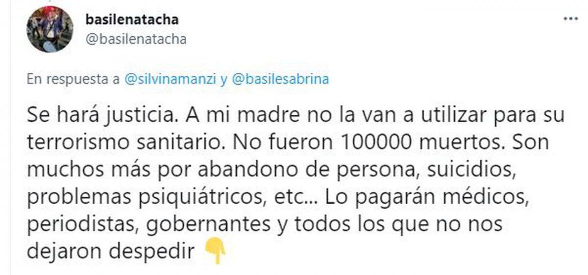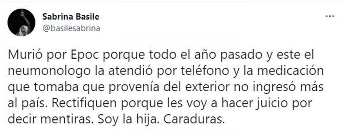 Si bien en primera instancia trascendió que la muerte había sido como consecuencia del coronavirus, las hijas utilizaron las redes sociales para aclarar que fue por EPOC, luego de no recibir la atención necesaria. “A mi madre la abandonaron como a todo el mundo durante el año pasado, que sólo atendían (casos de) Covid”, escribió Natacha Basile en su cuenta de Twitter.