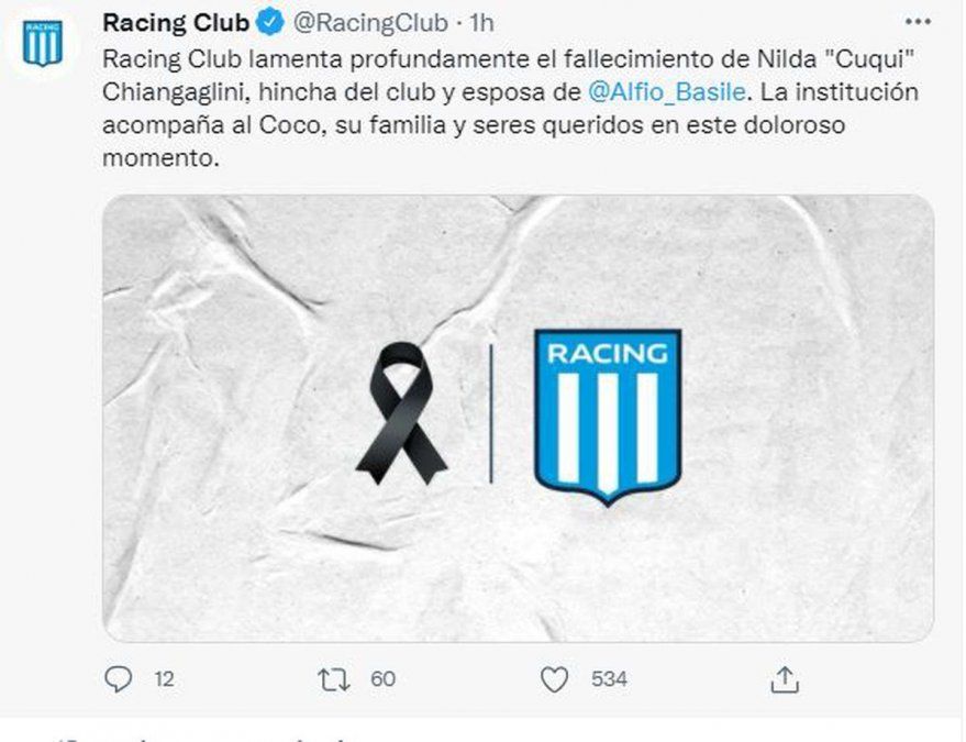 “Racing Club lamenta profundamente el fallecimiento de Nilda ‘Cuqui’ Chiangaglini, hincha del club y esposa de Alfio Basile. La institución acompaña al Coco, su familia y seres queridos en este doloroso momento”, publicó la Academia en su cuenta oficial de Twitter. Cientos de simpatizantes y seguidores del fútbol argentino le enviaron fuerzas al exentrenador y a todo su familia.