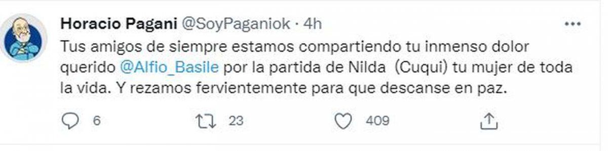 Quien también escribió un mensaje en sus redes sociales fue el periodista Horacio Pagani, amigo del Coco de toda la vida y del grupo familiar. “Tus amigos de siempre estamos compartiendo tu inmenso dolor querido Alfio Basile por la partida de Nilda (Cuqui), tu mujer de toda la vida. Y rezamos fervientemente para que descanse en paz”, escribió.