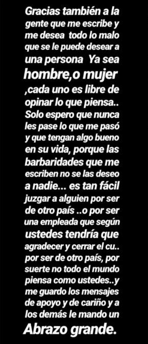 “Solo espero que nunca les pase lo que me pasó y que tengan algo bueno en su vida, porque las barbaridades que me escriben no se las deseo a nadie”, continuó la excuidadora de Beltrán, Bautista y Benicio. “Es tan fácil juzgar a alguien por ser de otro país o por ser una empleada que según ustedes tendría que agradecer y cerrar el cu… por ser de otro país, por suerte no todo el mundo piensa como ustedes”, concluyó furiosísima Viviana Benítez.