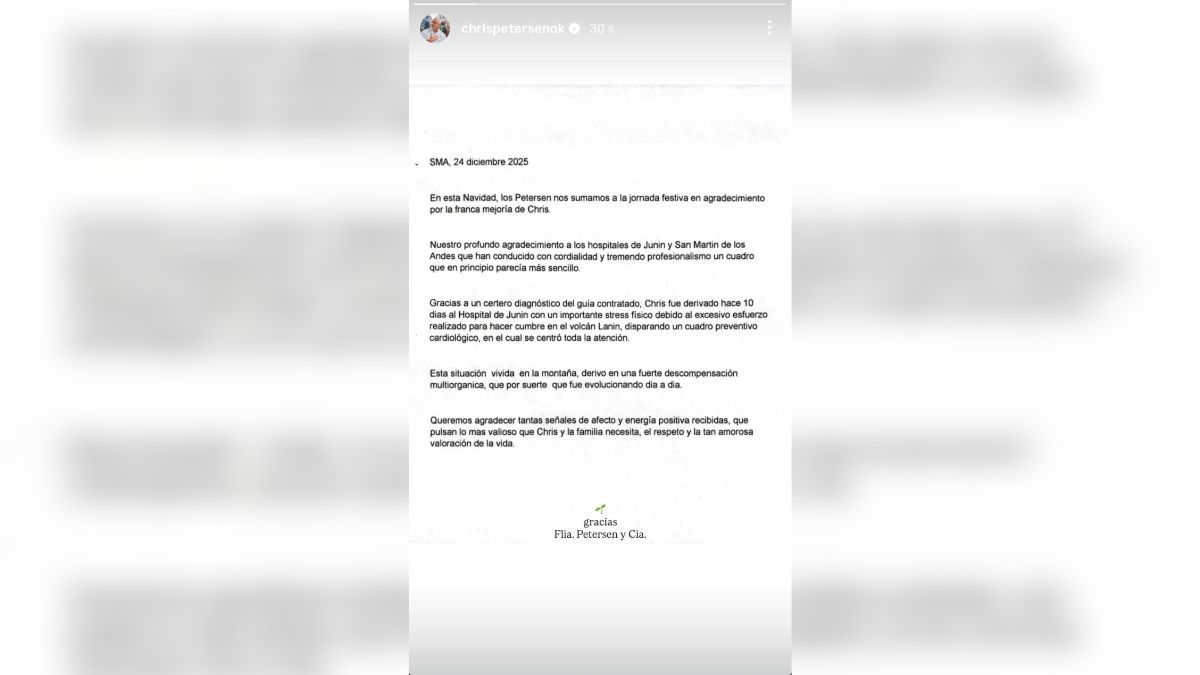 El mensaje fue compartido a través de las historias de Instagram de la cuenta oficial del cocinero y tuvo como principal objetivo bajar la incertidumbre en una fecha sensible como la Navidad. Allí, los familiares confirmaron que Petersen presenta una evolución favorable, aunque continúa bajo un estricto seguimiento médico.