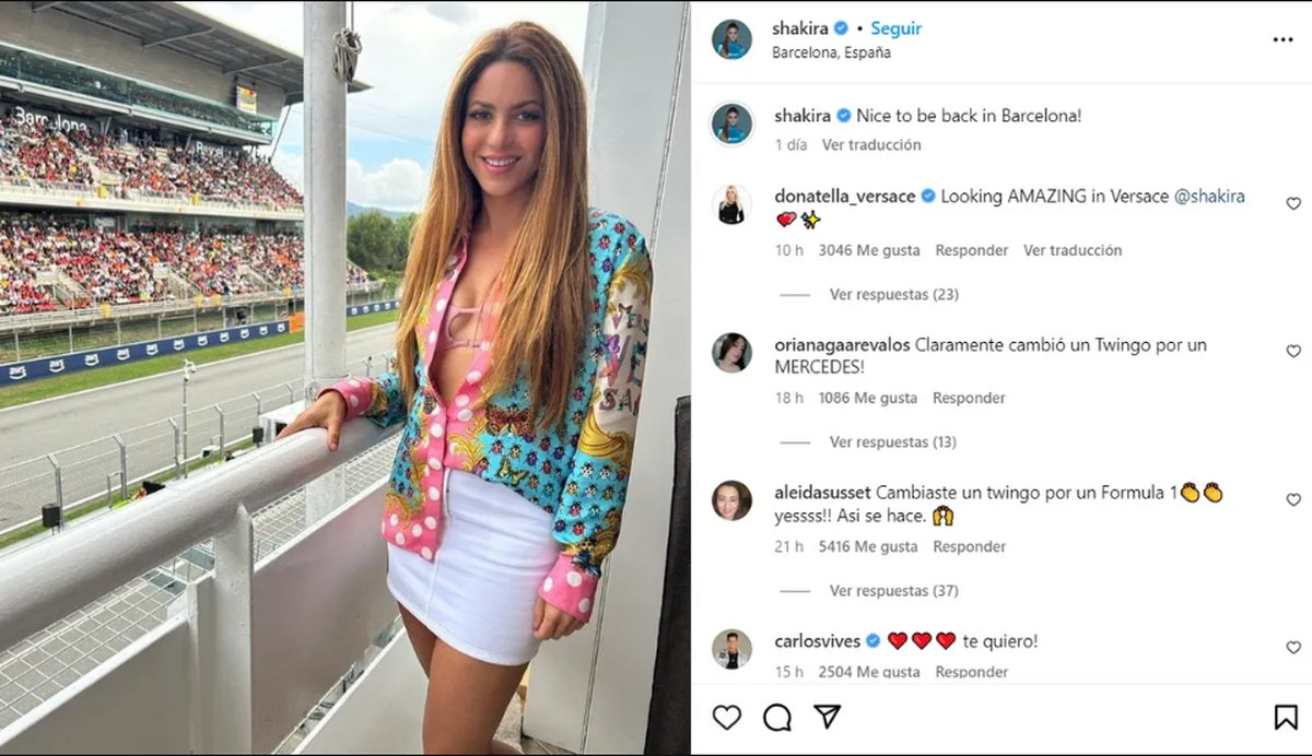 "Encantada de estar de vuelta en Barcelona!", expresó Shakira en su posteo de Instagram, posando en un sector privilegiado del evento deportivo y con la pista de carrera de fondo.