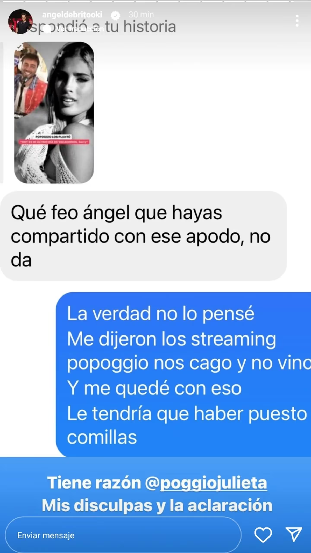 Julieta Poggio no tardó en confrontar a Ángel de Brito por este comentario. A través de un mensaje privado, expresó su descontento con el uso del apodo, señalando que era inapropiado. "Qué feo, Ángel, que hayas compartido con ese apodo... No da", le respondió Julieta, ofendida.