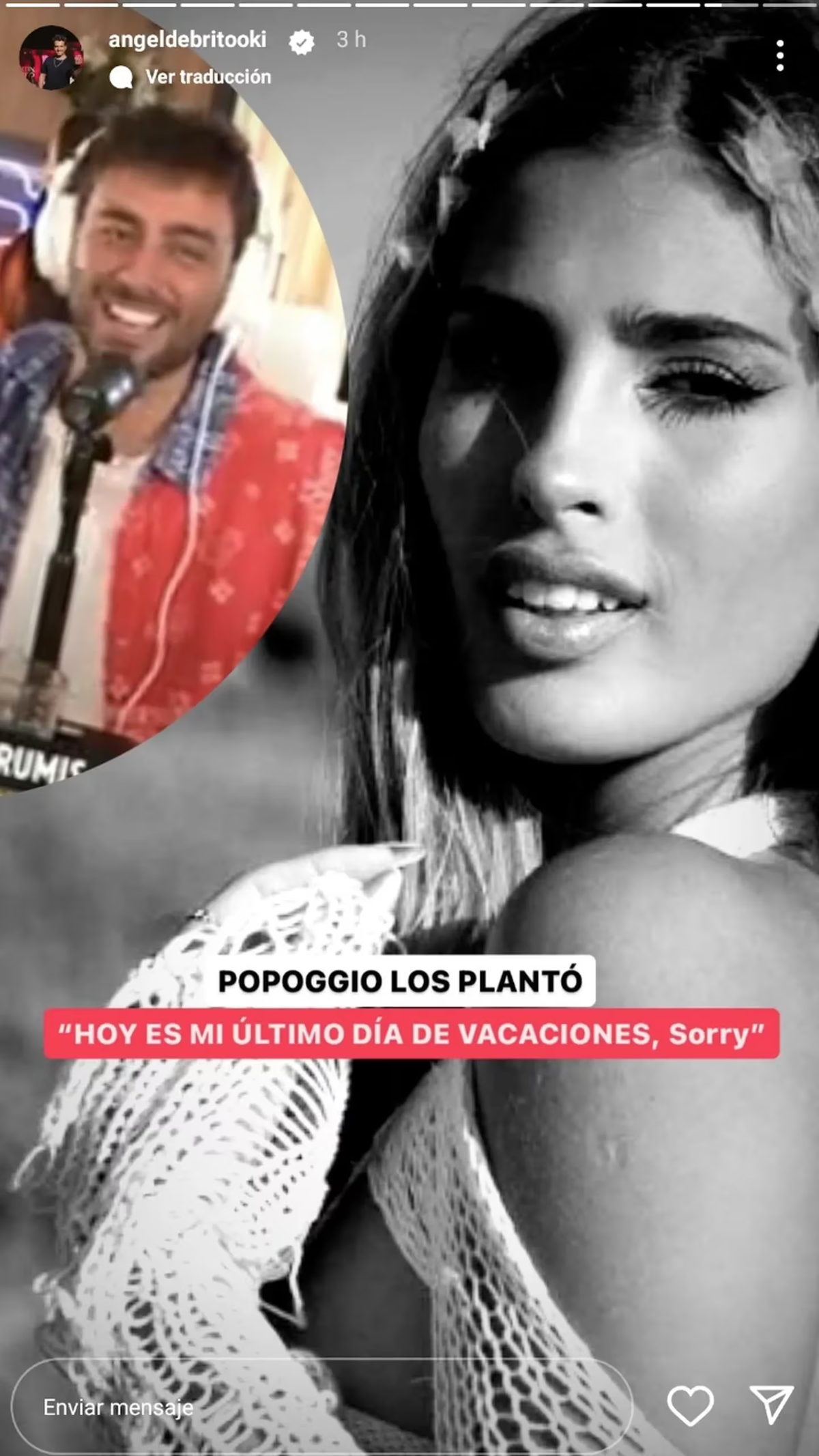 En su cuenta de Instagram, el conductor de LAM compartió una historia donde informaba la ausencia de Julieta Poggio en le programa. "Popoggio los plantó... 'Hoy es mi último día de vacaciones, perdón'", expresó Ángel, haciendo eco del apodo "Popoggio".