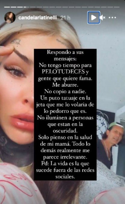 "No copio a nadie, un put... tatuaje en la jeta que me lo volaría de lo pedor... que es. No iluminen a personas que están en la oscuridad. Solo pienso en la salud de mi mamá. Todo lo demás me parece realmente irrelevante", dijo la mediática en relación a su mamá, Soledad Aquino, quien hace días recibió un trasplante de hígado. Por último, concluyó: "La vida es la que sucede fuera de las redes sociales".