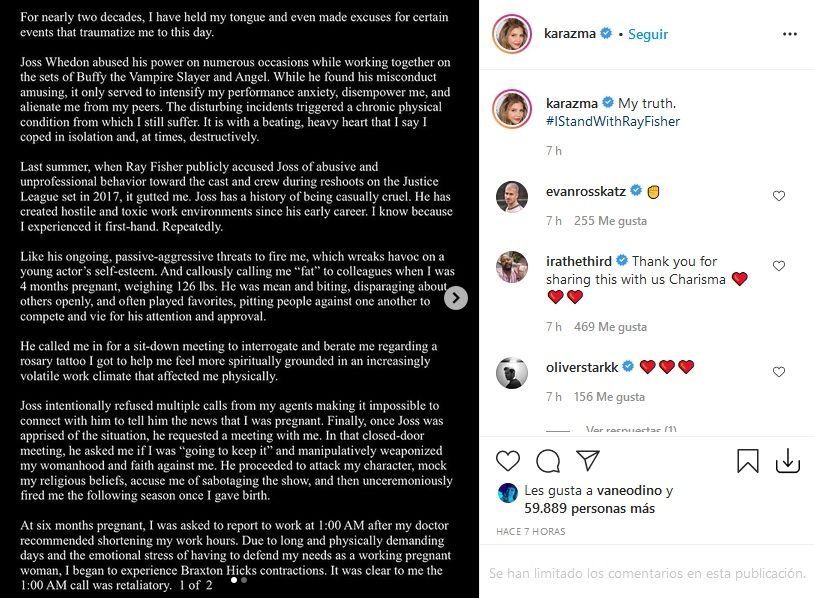 Titulado “Mi verdad”, Carpenter realizó un posteo en el cual contó en detalle cómo fue maltratada psicológicamente por el productor y realizador. El detonante de este mensaje surgió luego de que la actriz escuchara acusaciones similares por parte del actor de Liga de la Justicia, Ray Fisher, quien también acusó a Whedon de maltrato.
