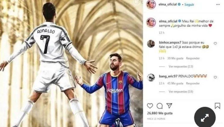 En la publicación se puede observar a Cristiano Ronaldo con su habitual celebración cuando marca un gol y un postrado Messi, que aparece de rodillas como si estuviera rezándole a Dios.