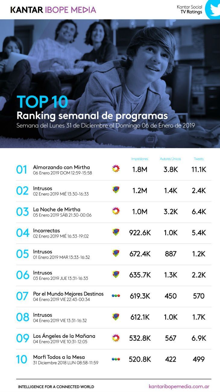 En ese sentido Mirtha se instaló en el podio por partida doble: se quedó con el primer lugar con sus almuerzos (con 1,8 millones de impresiones), y con el tercer puesto con el ciclo de los sábados a la noche (1 millón de impresiones). En la segunda colocación quedó Intrusos (también se llevó el quinto y sexto puesto). Así, y sin Andy a la vista, La Chiqui arrancó el 2019 con una sonrisa.