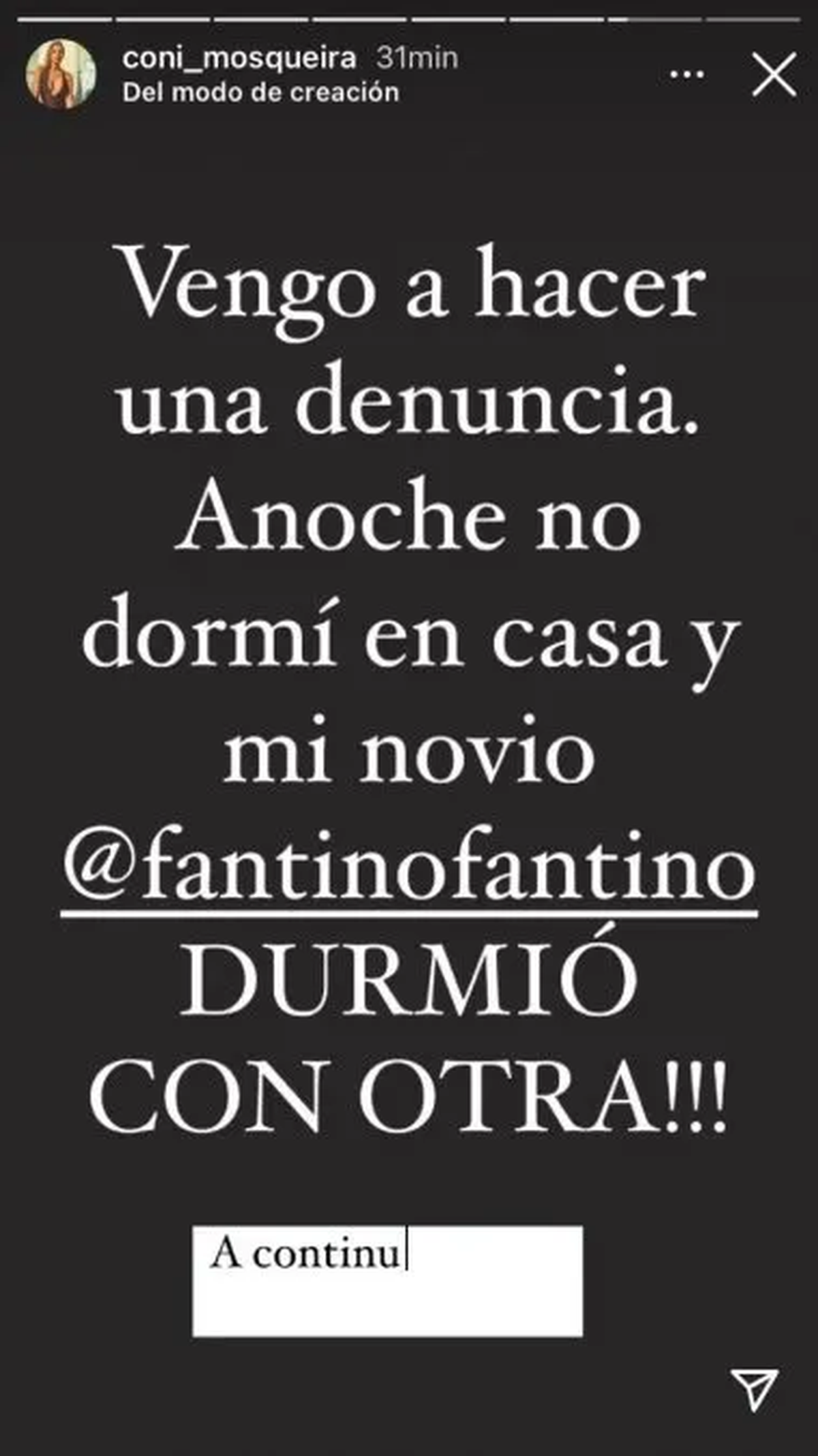 La modelo escribió: "Vengo a hacer una denuncia. Anoche no dormí en mi casa y mi novio durmió con otra". El mensaje estaba publicado en letras grandes blancas con un fondo negro y por supuesto todo el mundo esperó lo peor.