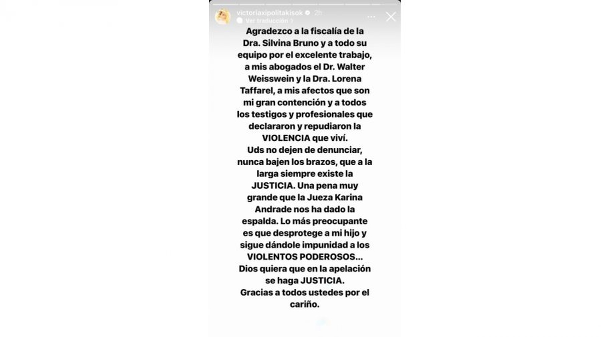 Ayer, tras enterarse de la noticia, Vicky Xipolitakis realizó un duro descargo en la red. "Agradezco a la fiscalía de la Dra. Silvina Bruno y a todo su equipo por el excelente trabajo, a mis abogados el Dr. Walter Weisswein y la Dra. Lorena Taffarel, a mi afectos que son mi gran contención y a todos los testigos y profesionales que declararon y repudiaron la violencia que viví", comenzó escribiendo la griega en sus stories de Instagram a modo de comunicado.