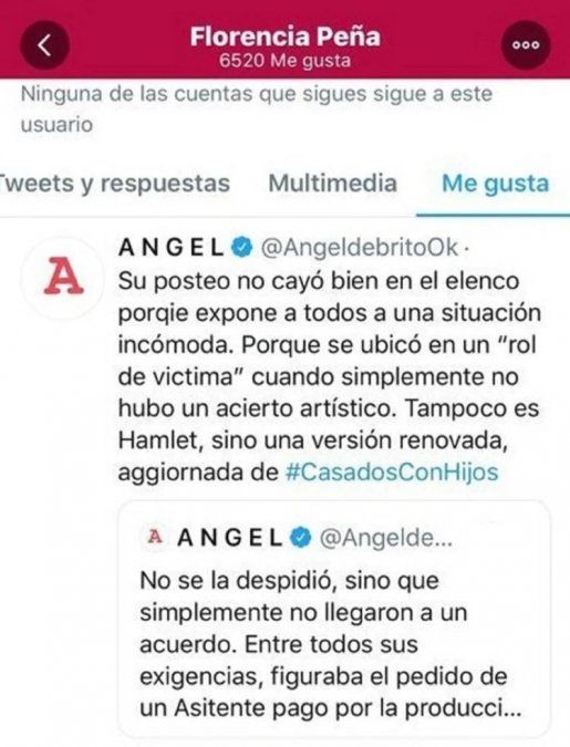 Lo cierto es que, al publicarse estas palabras Flor Peña tuvo una curiosa reacción. "Moni Argento" dio “me gusta” en una publicación en la que el periodista Ángel De Brito, explicó la verdad sobre la ausencia de "María Elena".