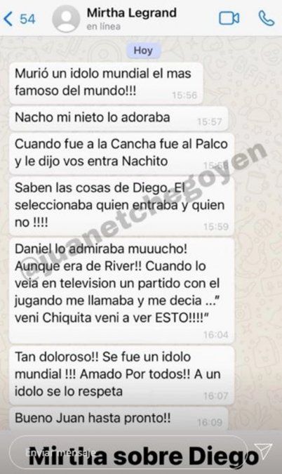 "Murió un ídolo mundial, ¡el más famoso del mundo! Mi nieto Nacho lo adoraba. Cuando fue a la cancha fue al palco y le dijo 'vos entrá, Nachito'. Daniel (Tinayre) lo admiraba mucho, aunque era de River. Cuando lo veía en televisión jugando me decía 'vení, Chiquita, vení a ver ésto'. ¡Tan doloroso! Se fue un ídolo mundial amado por todos. A un ídolo se lo respeta", expresó la diva en diálogo con Juan Etchegoyen.
