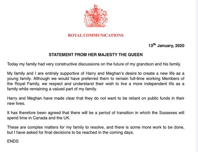 Finalmente, la reina Isabel hizo referencia hoy a la decisión que tomaron el pasado 8 de enero los duques de Sussex, el príncipe Harry y su esposa, la actriz norteamericana Meghan Markle, quienes anunciaron que ponían fin a sus obligaciones como miembros de la Familia Real británica. "Hoy mi familia tuvo discusiones muy constructivas sobre el futuro de mi nieto y su familia. Mi familia y yo apoyamos por completo el deseo de Harry y Meghan de crear una nueva vida como una familia joven”, señaló la mujer de 93 años mediante un comunicado, intentando poner así un freno al escándalo que escalaba en todo el Reino Unido.