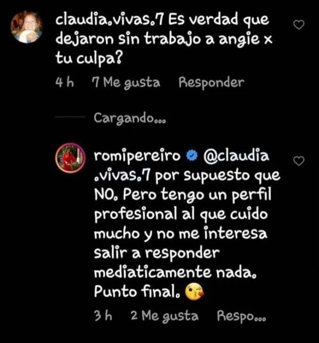 A través de su cuenta de Instagram, una usuaria le preguntó si era verdad que ella fue la responsable de que la amiga de Pampita se quedara sin trabajo en el programa de su marido. Sin dudarlo, Pereiro contestó: "Por supuesto que no es verdad. Tengo un perfil profesional al que cuido mucho y no me interesa salir a responder mediáticamente nada. Punto final".