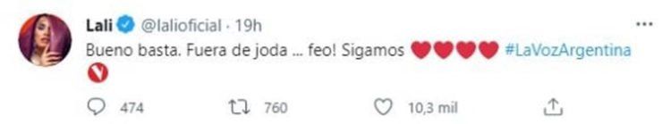 Mientras Telefe estaba emitiendo el enojo y discusión entre las dos chicas que competían en La batalla y sus coaches, Lali irrumpió en las redes sociales para opinar sobre la situación que protagonizaron sus compañeros de jurado y las dos participantes del reality.